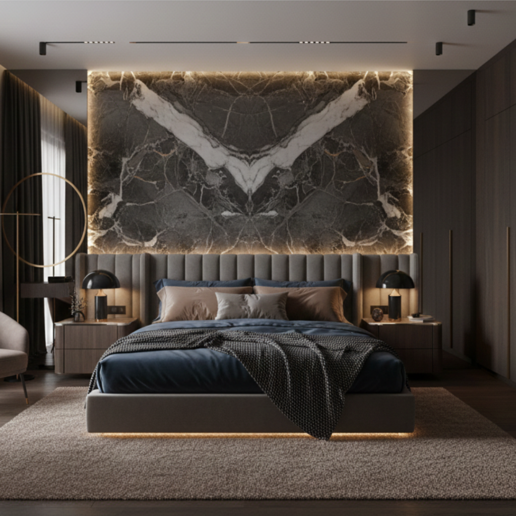 The color palette often includes deeper hues such as charcoal, navy, taupe, or earthy tones, balanced with metallic accents in brass or gold. Layered lighting—combining ambient, task, and accent lighting—adds depth and drama to the space. Every element, from fabric selection to wardrobe finishes, is curated to create a hotel-like experience at home, reflecting comfort, exclusivity, and modern luxury.