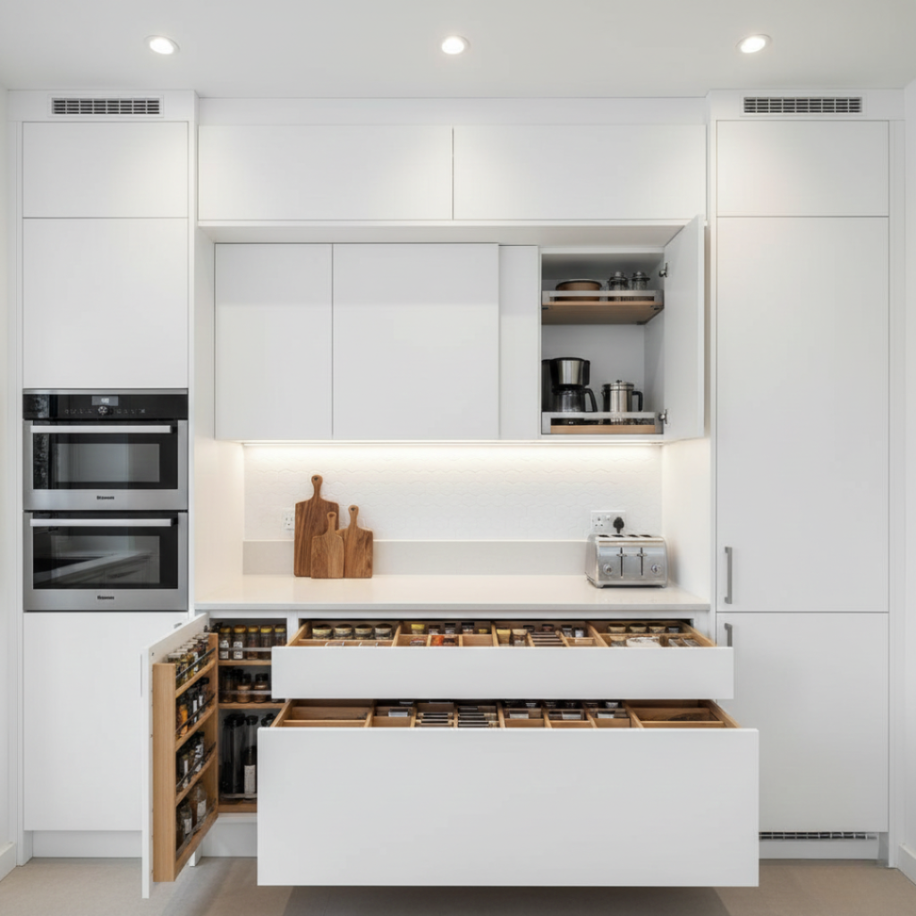 A well-organized kitchen is essential for a smooth cooking experience, and storage-focused designs ensure every inch of space is utilized effectively. Vertical cabinets, overhead lofts, built-in spice racks, appliance garages, and customized drawers keep essentials neatly arranged and easily accessible.