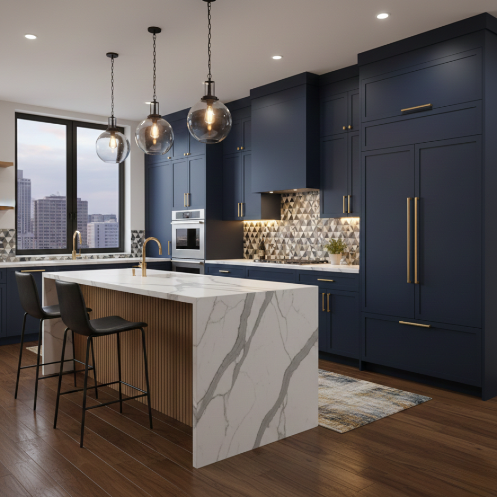 For homeowners who want their kitchen to make a statement, contemporary designs with bold accents are an excellent choice. This style combines modern materials with striking color contrasts, textured finishes, and statement lighting. Bold cabinet colors such as navy blue, forest green, or charcoal grey can be paired with neutral countertops for balance.