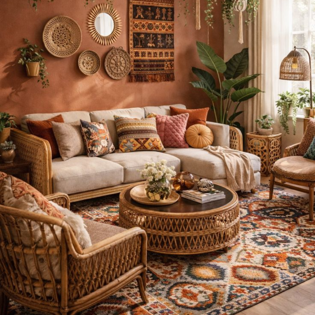 Bohemian design celebrates creativity and individuality. Bold colors express vibrant energy. Layered textiles add depth and comfort. Handmade décor brings personal character. Patterned rugs create visual warmth. Global influences enrich the style. Indoor plants enhance natural beauty. Eclectic furniture adds charm. Artistic lighting creates a cozy mood. This style suits free-spirited and expressive homes.